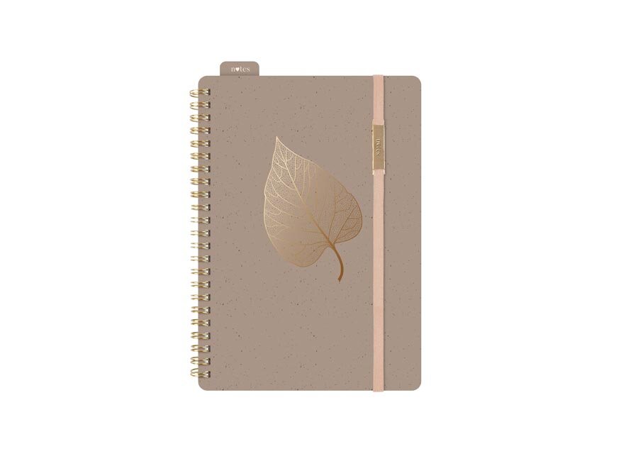 Vďaka teplému hnedému odtieňu obálky a jemnému zlatému motívu listu pôsobí poznámkový blok prirodzene a zároveň sofistikovane. Pevná špirálová väzba umožňuje jednoduché otáčanie stránok a komfortné písanie na celú plochu. Praktická gumička udrží blok bezpečne zatvorený, takže vaše poznámky zostanú vždy chránené, a záložka „notes“ vám pomôže rýchlo nájsť správnu stránku.