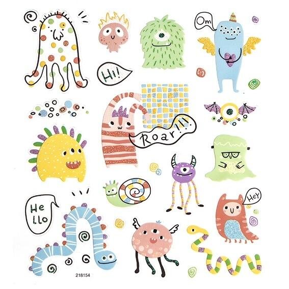 Foliowe naklejki z motywami słodkich potworów w pastelowych kolorach z brokatem, wywołają uśmiech na twarzy każdego, nie tylko dziecka.Wykonane są z wysoką dbałością o detale, mają stylowe i nowoczesne wzornictwo i mogą być efektowną dekoracją w pokoju dziecięcym jak i elementami do zdobienia...