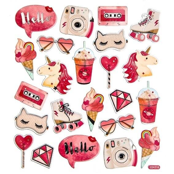 Foliowe naklejki ze słodkimi, różowymi motywami takimi jak np. rolki, lizaki, okulary, kasety magnetofonowe czy rolki.Wyrazisty, różowy kolor i srebrne wykończenie nadają naklejkom stylowego charakteru.Te słodkie naklejki mogą być efektowną dekoracją pokoju czy biurka nastolatki jak i elementami...