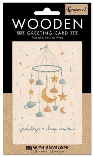 Drewniany karnet w formacie C6 z kopertą. W środku nie zawiera tekstu. Ten karnet jest w 100% biodegradowalny, wykonany przy użyciu minimalnego nakładu energii, gazu i wody. Jego wytworzenie zużywa 5 razy mniej drewna niż wykonanie karnetu papierowego. Wyprodukowany na Litwie.