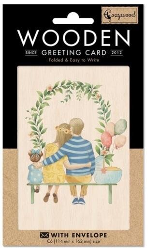 Drewniany karnet w formacie C6 z kopertą. W środku nie zawiera tekstu. Ten karnet jest w 100% biodegradowalny, wykonany przy użyciu minimalnego nakładu energii, gazu i wody. Jego wytworzenie zużywa 5 razy mniej drewna niż wykonanie karnetu papierowego. Wyprodukowany na Litwie.