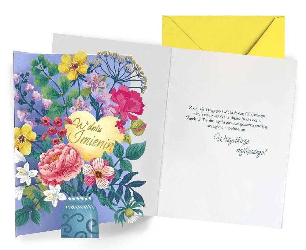 Kartka Dream Cards "W dniu imienin" DK-1275 Kartka B6 z ozdobnej serii Dream Cards - nieduża, ale robi wrażenie dzięki atrakcyjnej kolorystyce i ciekawym zdobieniom. To idealny wybór łączący przyjazną cenę z jakością. Cechy szczególne: wielkość: B6, 16.6 x 11.7 cm po złożeniu, koperta: w...