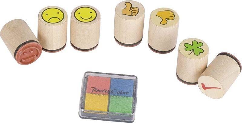 Set Pečiatky v poháriku obsahuje sedem drevených pečiatok s motívmi, ktoré deti používajú v rôznych situáciách: štvorlístok, usmievavá tvár, smutná tvár, vážna tvár, palec hore, palec dolu a vtáčik ako ocenenie. K tomu navyše získate štyri atramentové podušky v jasných farbách: žltá, oranžová, modrá a zelená. Pečiatky sú vyrobené z kvalitného dreva, čo zaručuje ich dlhú životnosť a príjemné používanie.