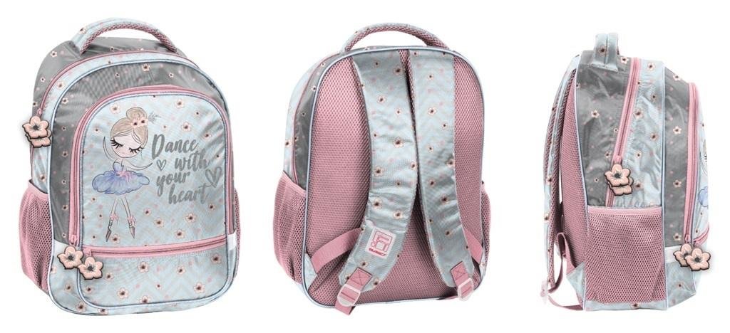 Plecak dwukomorowy szkolny, jedna płaska mała kieszeń na froncie, dwie boczne kieszenie z siatki (mieszczą małą butelkę, bidon lub termos). Elementy odblaskowe, usztywnione plecy pokryte siatką. Wygodny uchwyt do przenoszenia. Wygodne pullery ułatwiające odpinanie zamków.