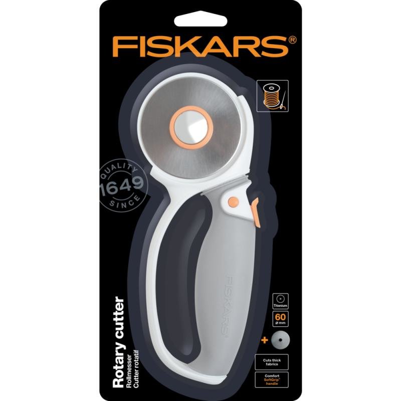 Řezací kolečko na látku Fiskars 1004753 má rukojeť s povrchem SoftGrip™ pro větší pohodlí a kontrolu. Čepel potažená karbidem titanu pro vyšší řeznou kapacitu a odolnost. Pomocí oranžového tlačítka uzamknete a odemknete čepel. Čepel lze umístit po obou stranách řezačky pro praváky nebo leváky. Čepel je výměnná a dodává se jako náhradní díl. Pro praváky i leváky.