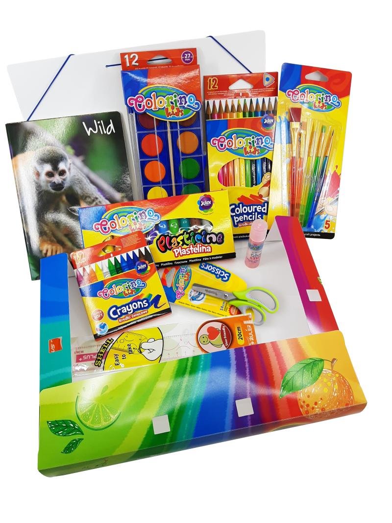 Balíček školních potřeb balený v krásně barevném platovém boxu. Obsah: plastové desky, modelovací hmota 12 barev, voskovky kulaté 12 barev, vodové barvy se štětcem 12 barev, pastelky trojhranné 12 barev, sada štětců 5 ks, pastel lepicí tyčinka, nůžky dětské 14 cm, transparentní pravítko 20 cm, poznámkový sešit A5. Rozměry boxu: 32 x 24 x 5 cm.