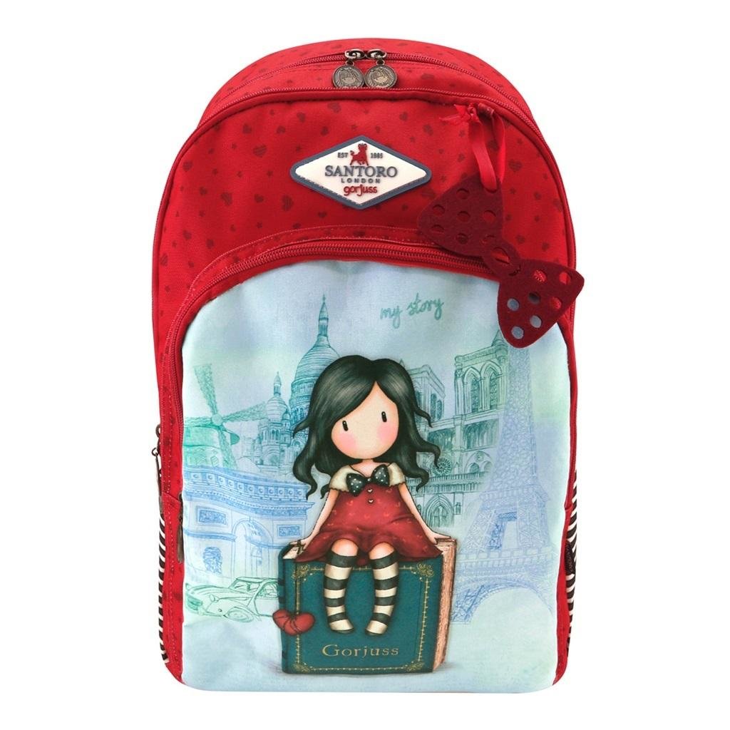 Plecak z trzema kieszeniami - Gorjuss - My StoryWyjątkowo praktyczny i piękny plecak z wizerunkiem dziewczynki Gorjuss w odcieniach rubinowej czerwieni i głębokiego turkusu.Ma miękkie i wygodne uchwyty do założenia na plecy z regulacją długości.Kieszenie zamykane na suwaki ozdobione medalionami w...