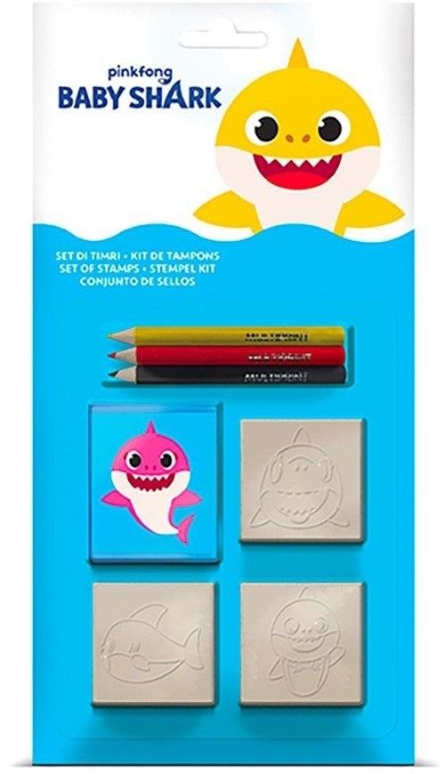 Pieczątki Baby Shark. W skład zestawu wchodzą: 3 drewniano-gumowe pieczątki, 1 poduszeczka do tuszu i 3 kolorowe kredki ołówkowe. prečítať celé