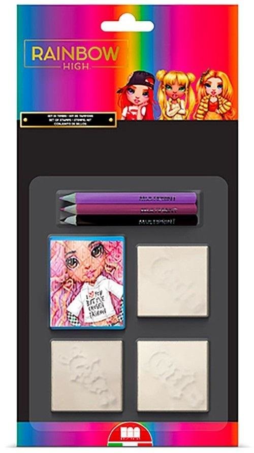 Pieczątki Rainbow High. W skład zestawu wchodzą: 3 drewniano-gumowe pieczątki, 1 poduszeczka do tuszu i 3 kolorowe kredki ołówkowe. prečítať celé