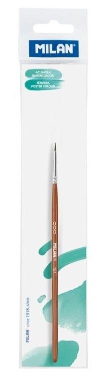 Szkolny okrągły pędzel serii 101 nr 000 z krótkim drewnianym trzonkiem. Skład: 70% naturalnego włosia koziego + 30% syntetyczne. Brązowe lakierowane wykończenie i aluminiowa skuwka bez spawania, odporna na rdzewienie. Bardzo miękkie włosie idealne do akwareli, technik wodnych i farb plakatowych....