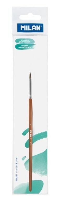 Szkolny okrągły pędzel serii 101 nr 4 z krótkim drewnianym trzonkiem. Skład: 70% naturalnego włosia koziego + 30% syntetyczne. Brązowe lakierowane wykończenie i aluminiowa skuwka bez spawania, odporna na rdzewienie. Bardzo miękkie włosie idealne do akwareli, technik wodnych i farb plakatowych....