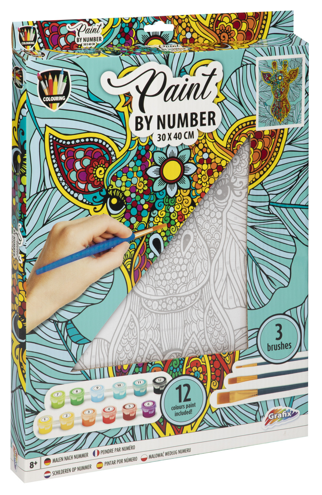 Tento balík obsahuje bavlnené plátno o rozmere 30×40 cm s predtlačeným motívom žirafy, ktorý je rozdelený na jednotlivé oblasti označené číslami. K dispozícii je 12 farieb špeciálnej akrylovej farby a 3 štetce rôznej veľkosti, vďaka ktorým ľahko zvládnete vyfarbenie aj tých najjemnejších detailov. Vymaľovaním vznikne nádherný obraz, ktorý môžete vystaviť doma, v kancelárii alebo ho darovať ako originálny darček.
