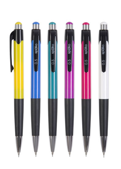 Plastová mikrotužka se zasouvacím hrotem a pogumovaným gripem pro pohodlný úchop. Kombinace 6 barev. Tuha: 0,5 mm. prečítať celé