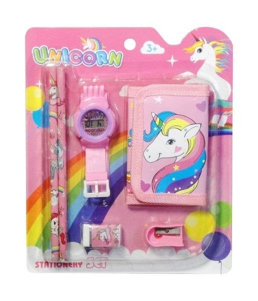 Zestaw podręczny do szkoły dla dzieci z motywem jednorożców w skład którego wchodzi: portfel, zegarek, 2 ołówki, gumka do mazania i temperówka.Zegarek działa na baterie typu AG3. Bateria znajduje się w zabawce. Produkt dla dzieci od 3 lat. Podane wymiary są wymiarami opakowania. Zabawka zapakowana w kartonową podstawkę z przezroczystym kloszem. Produkt występuje w kilku wersjach kolorystycznych, wybierany losowo. Cena dotyczy jednej sztuki.