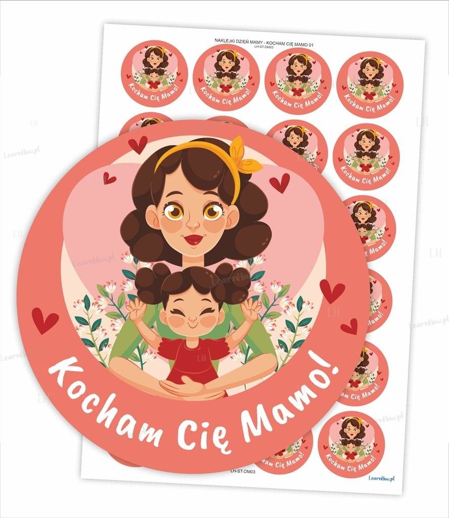 NAKLEJKI DZIEŃ MAMY - MAMA - KOCHAM CIĘ MAMO!(średnica 40mm, zestaw 24 naklejek)Zestaw 24 naklejek z okazji dnia Mamy - idealne jako skromny upominek dla Mamy.Świetnie sprawdzą się na szkolnej gazetce, w pięknych laurkach, jako urocza wklejka do kalendarza.Naklejki z napisem Kocham Cię Mamo! -...