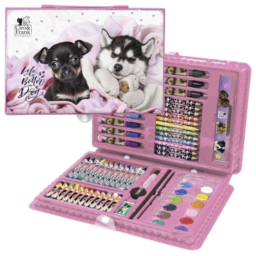 Zestaw artykułów plastycznych w walizce. W skład zestawu wchodzą: linijka, 12 pisaków, 12 kredek ołówkowych, 12 farb akwarelowych, 1 pędzel, 1 ołówek, klej, temperówka, gumka do mazania, 12 kredek woskowych, 12 pasteli woskowych + kolorowanka (4 kartki) + przeźroczysta paleta.