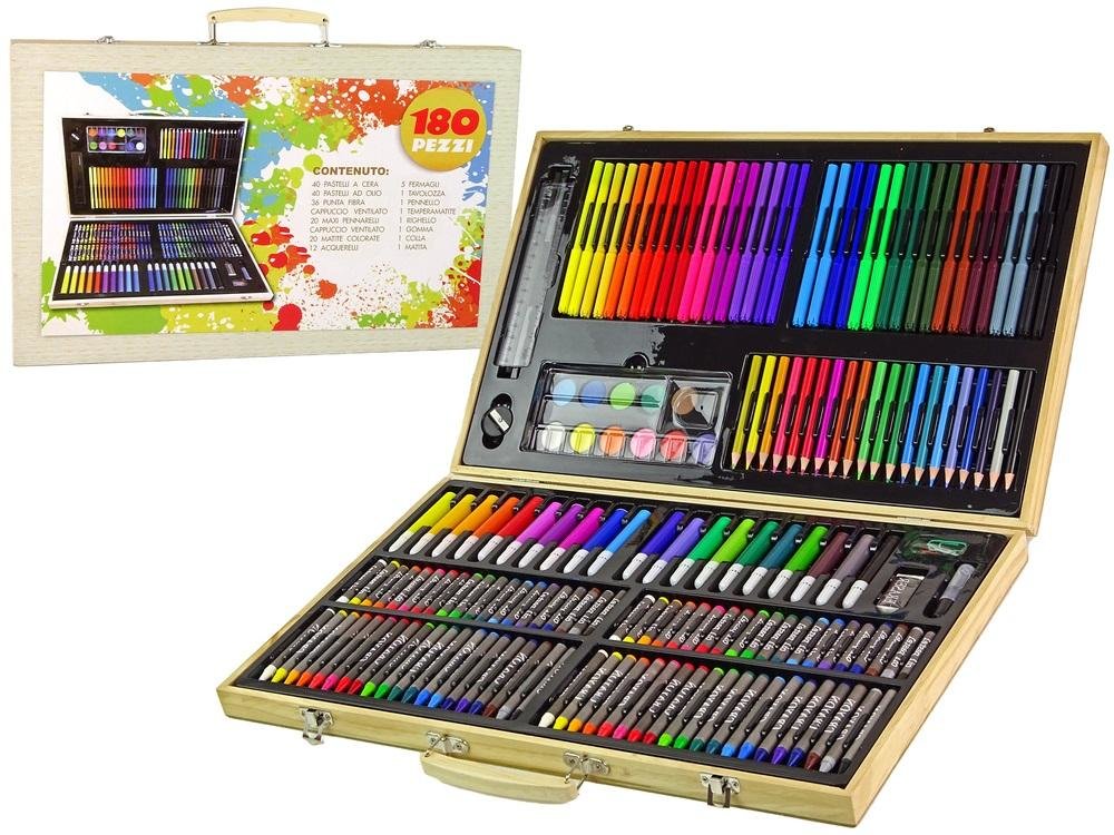 Zestaw Artystyczny Do Malowania Drewniana Walizka 180 Elementów Rozbudź wyobraźnie oraz kreatywne zdolności swojego dziecka z zestawem artystycznym. Magiczna walizka zawiera wszystko co potrzebne do zabawy: kredki, pisaki, pastele, farby i inne przydatne do twórczości artystycznej przedmioty:...
