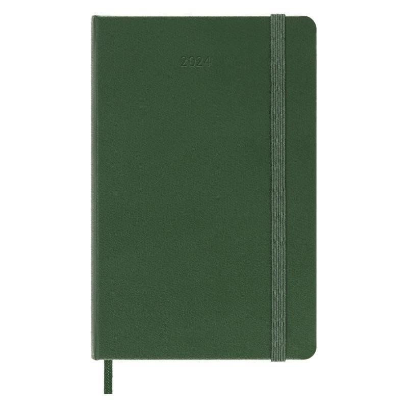 Zelenýplánovací zápisník kapesní velikosti na rok 2024. Na levé straně jsou dny v týdnu a na pravé linkovaná stránka na poznámky. Diář má pevnou vazbu v kartonových deskách. Obepíná ho pružná páska proti samovolnému otevírání. Obsahuje praktickou vnitřní kapsu, textilní záložku, 3 sady samolepek a 1 sadu samolepek s letopočty. Papír s gramáží 70 g/m2 neobsahuje kyseliny.