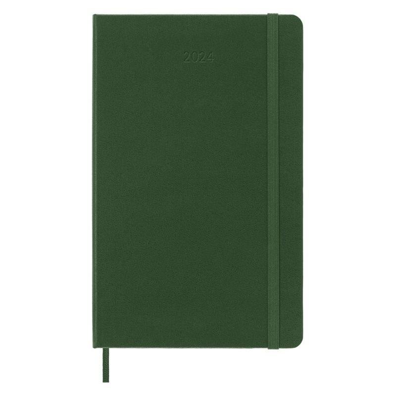 Velký zelenýplánovací zápisník na rok 2024. Na levé straně jsou dny v týdnu a na pravé linkovaná stránka na poznámky. Diář má pevnou vazbu v kartonových deskách. Obepíná ho pružná páska proti samovolnému otevírání. Obsahuje praktickou vnitřní kapsu, textilní záložku, 3 sady samolepek a 1 sadu samolepek s letopočty. Papír s gramáží 70 g/m2 neobsahuje kyseliny.