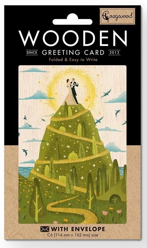 Drewniany karnet w formacie C6 z kopertą. W środku nie zawiera tekstu. Ten karnet jest w 100% biodegradowalny, wykonany przy użyciu minimalnego nakładu energii, gazu i wody. Jego wytworzenie zużywa 5 razy mniej drewna niż wykonanie karnetu papierowego. Wyprodukowany na Litwie.