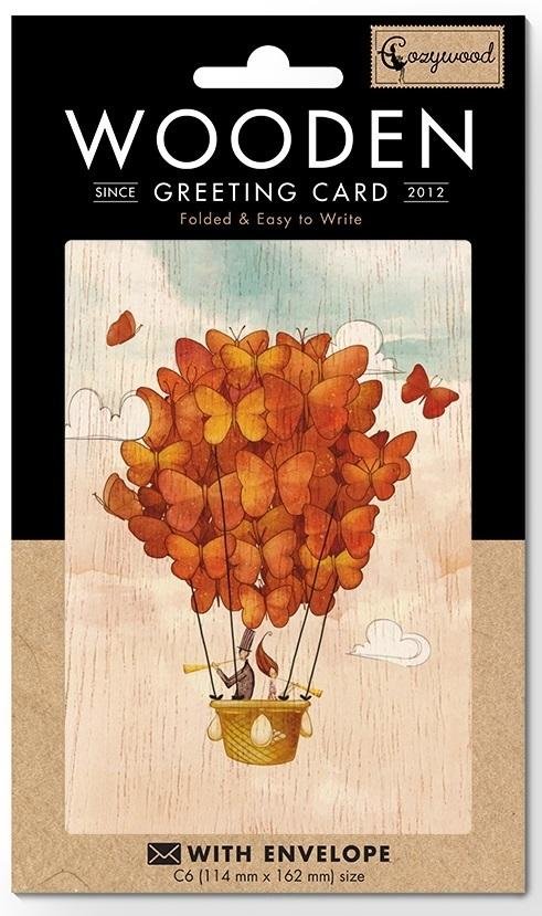 Drewniany karnet w formacie C6 z kopertą. W środku nie zawiera tekstu. Ten karnet jest w 100% biodegradowalny, wykonany przy użyciu minimalnego nakładu energii, gazu i wody. Jego wytworzenie zużywa 5 razy mniej drewna niż wykonanie karnetu papierowego. Wyprodukowany na Litwie.