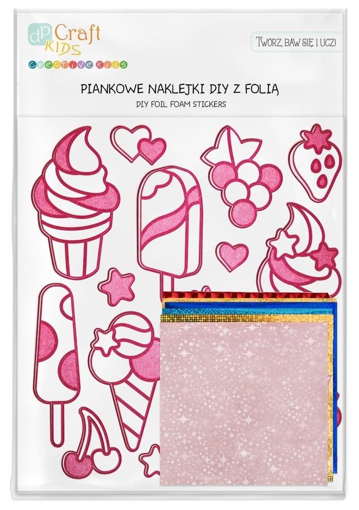Urocze, piankowe naklejki z motywami lodów, owoców oraz drobnych serduszek do samodzielnego wykonania to fantastyczny prezent dla dziecka! Do zestawu dołączonych jest 10 kolorów błyszczących arkuszy folii, służących do udekorowania nalepek.W jaki sposób przyozdobić naklejki?1. Należy odkleić...