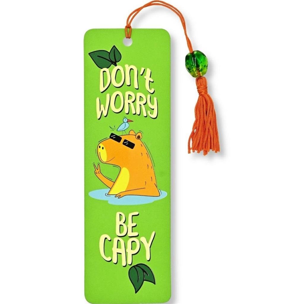 Zakładka ma dopasowaną kolorystycznie wstążkę z frędzlem oraz koralik. Barwny, trwały, zabawny nadruk z kapibarą sprawi, że czytanie będzie jeszcze ciekawsze - pamiętaj - Don't Worry, Be Capy. Każda zakładka jest drukowana na trwałym, powlekanym kartonie i pakowana w przezroczystą osłonkę. Uniwersalny wymiar 6,4 x 18,1 cm.