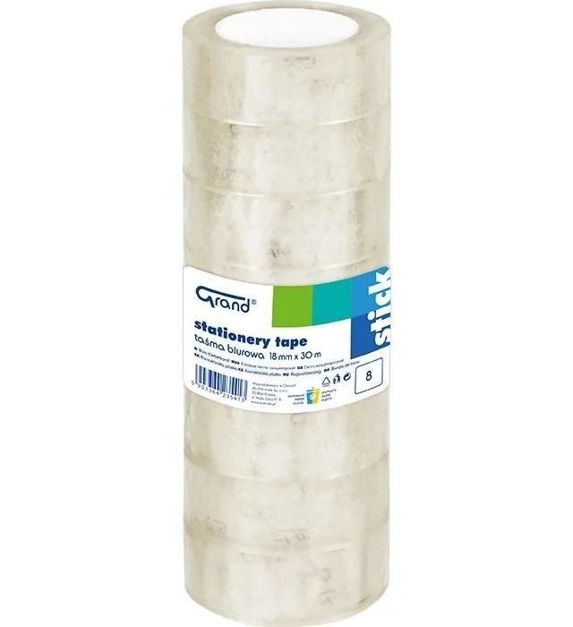 Taśma biurowa 18mmx30m 8szt GRANDgrubość 40 mikronówidealnie przezroczysta, bezwonnawykonana z polipropylenupokryta emulsyjnym klejem akrylowym na bazie wodynie zawiera rozpuszczalników organicznychstabilna substancja klejąca odporna na działanie światławzmocniona powłoka taśmy odporna na...