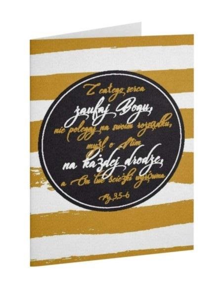 Kartka składana z kopertą.Kartka zawiera tekst:Z całego serca zaufaj Bogu, nie polegaj na swoim rozsądku, myśl o nim na każdej drodze, a On twe ścieżki wyrówna.Kartka, w której możesz wpisać dowolny tekst życzeń na dowolną okazję. prečítať celé
