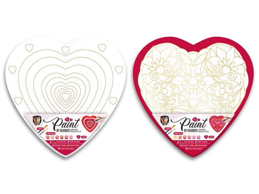 Malování podle čísel Srdce – dva druhy . Součástí balení je 6 vodových barev a dva štětce plochý a kulatý. Velikost obrázku 29×29 cm. prečítať celé
