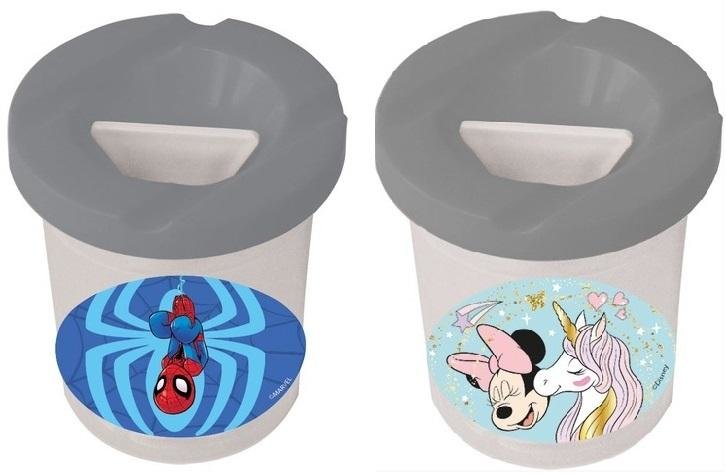 Kubek niekapek na wodę z blokadą wylaniaplastikowy pojemnik do płukania pędzli z systemem lejka zabezpieczającym przed rozlaniem wodyna pokrywce znajdują się dwa wgłębienia przeznaczone do odkładania pędzelkaodpowiedni dla małych dzieciPojemność 250 mlMix wzorów, towar wysyłany losowo
