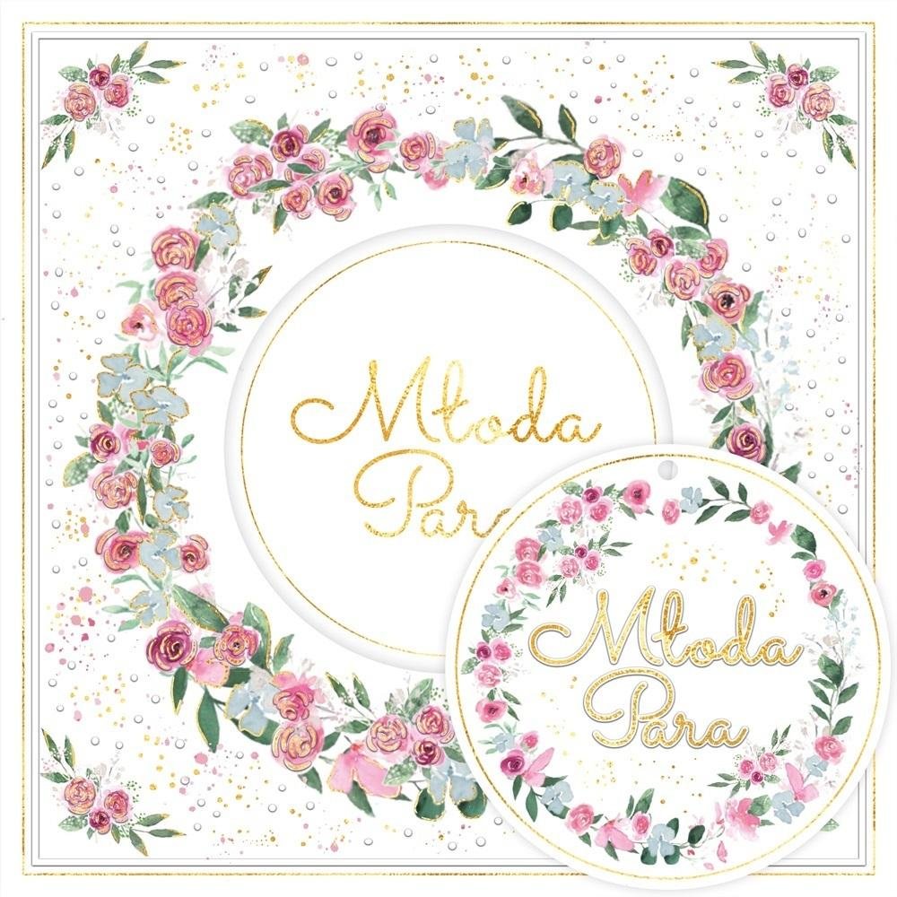 Składany z trzech stron kwadratowy karnet o wymiarach 15 x 15 cm z wyciętym elementem na froncie. Złocony i tłoczony, teksy życzeń w środku. Wydrukowany na wysokiej jakości papierze. W zestawie bilecik do prezentu oraz koperta. prečítať celé