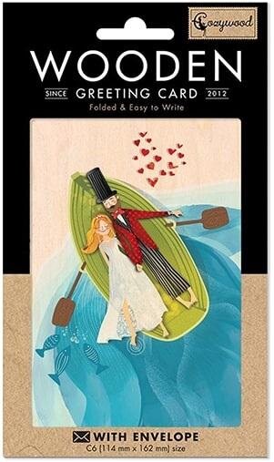 Drewniany karnet w formacie C6 z kopertą. W środku nie zawiera tekstu. Ten karnet jest w 100% biodegradowalny, wykonany przy użyciu minimalnego nakładu energii, gazu i wody. Jego wytworzenie zużywa 5 razy mniej drewna niż wykonanie karnetu papierowego. Wyprodukowany na Litwie.