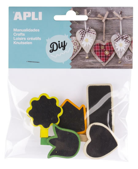 Dřevěné kolíčky s tabulovou destičkou různých tvarů - obdélník, srdíčko, tulipán, domeček, kytička. Různé barevné provedení v mixu. Materiál: přírodní dřevo. Rozměry: cca 30 mm destička, kolíček 35 mm. Vhodné pro tvorbu dekorací, kreativní a pedagogické aktivity. Vhodné pro děti od 3 let. Balení: 5 ks.