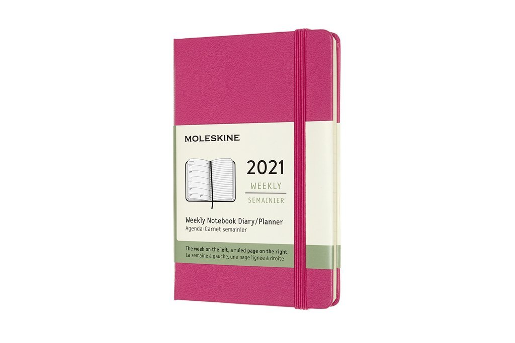 Růžový plánovací zápisník kapesní velikosti na rok 2021. Na levé straně jsou dny v týdnu a na pravé linkovaná stránka na poznámky. Diář má pevnou vazbu v kartonových deskách. Obepíná ho pružná páska proti samovolnému otevírání. Obsahuje praktickou vnitřní kapsu, textilní záložku a 295 barevných...