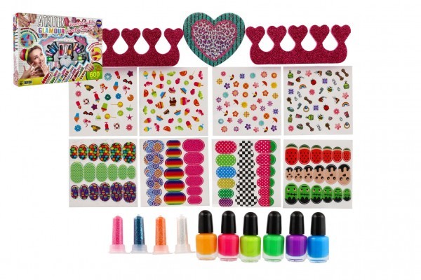 Vytvoř si skvělé barevné nehty, které můžeš měnit podle nálady. Sada obsahuje 6 barevných laků na nehty (4ml x 6), 5 barev brokátu (1g x 5), 108 nálepek na nehty, 154 mini nálepek, 172 malých nálepek, 38 měnících pásků, pilník, štětec, 2 separátory na prsty, návod (celkem 600 ks).