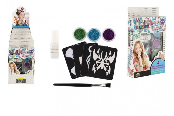 Sada obsahuje lepidlo na tetování (5ml), 3 brokátové barvy (1,7gx3), šablony, štětec a návod.