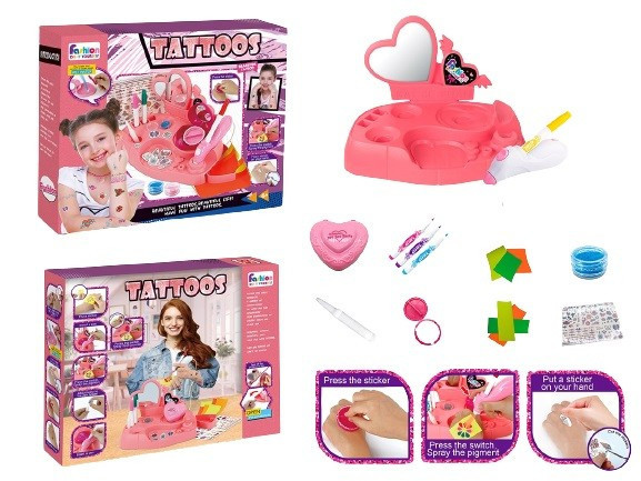 Zestaw do robienia tatuaży Zestaw do robienia tatuaży. Twórz własne tatuaże za pomocą tego zestawu do tatuażu! Z zestawem wykonasz nie tylko tatuaże z brokatem, ale również ozdobisz tatuażami-naklejkami i kolorowymi mazakami.  Tatuaże są bezpieczne w użyciu. prečítať celé