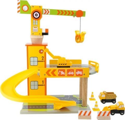 Dětské srdce bude bít rychleji! Tato nádherná kombinace parkoviště a stavby nabízí zábavu na několik hodin. Jeřáb lze otáčet a je vybaven velkými kleštěmi, které mohou zvedat různé komponenty. Garáž má výtah, 3 dřevěná vozidla s pohyblivými plastovými díly a konstrukční překážky.Německá firma...