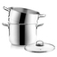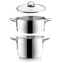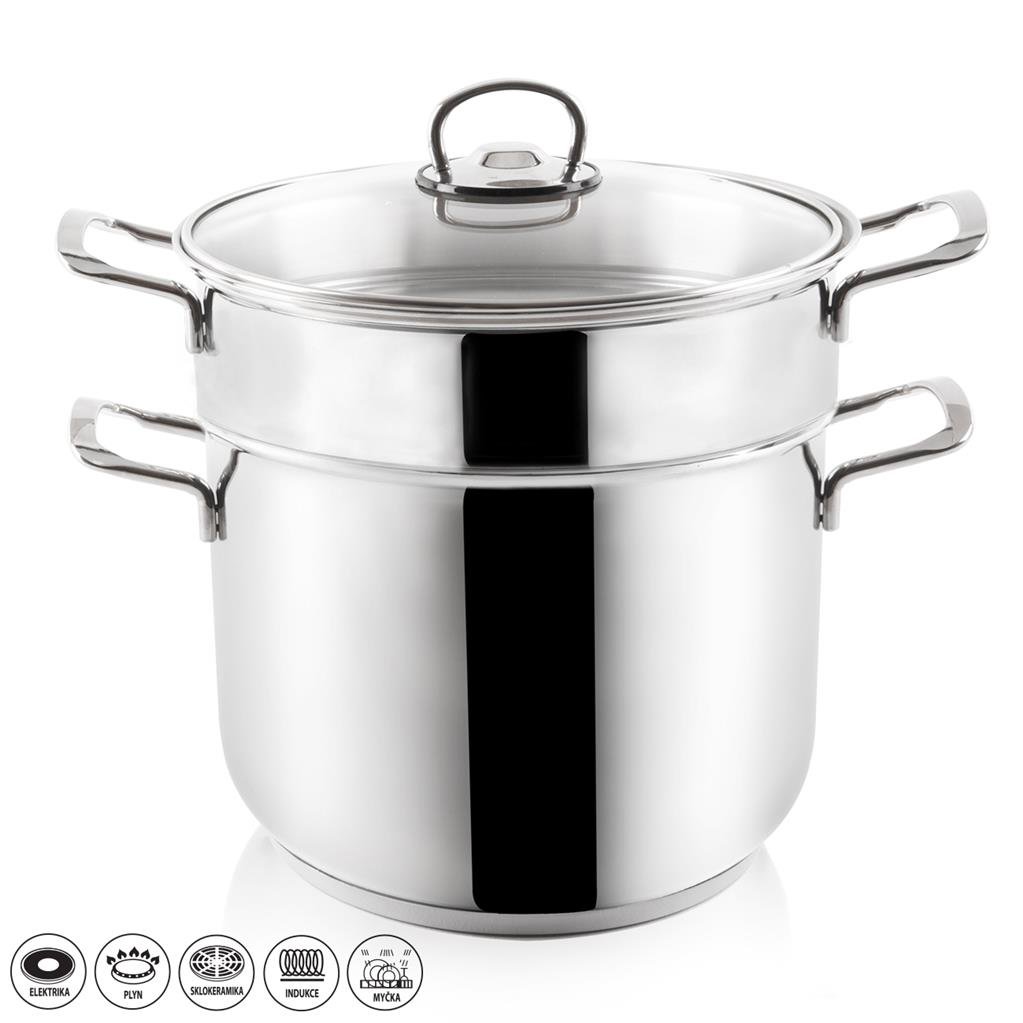 Napařovací hrnec je vhodný pro klasické vaření - těstoviny i jiné přílohy, zelenina... Využijete ho také pro vaření v páře, napařování knedlíků. Sestava obsahuje hrnec se sendvičovým dnem, 9 cm hluboký napařovací hrnec s otvory a skleněnou poklici s otvorem pro únik páry. Materiál: kvalitní nerezová ocel třídy 304, sklo. Rozměry: objem 5 l, pr. 22 cm, v. celé sestavy 26 cm. Hrnec je vhodný na všechny typy tepelných zdrojů i do myčky na nádobí.