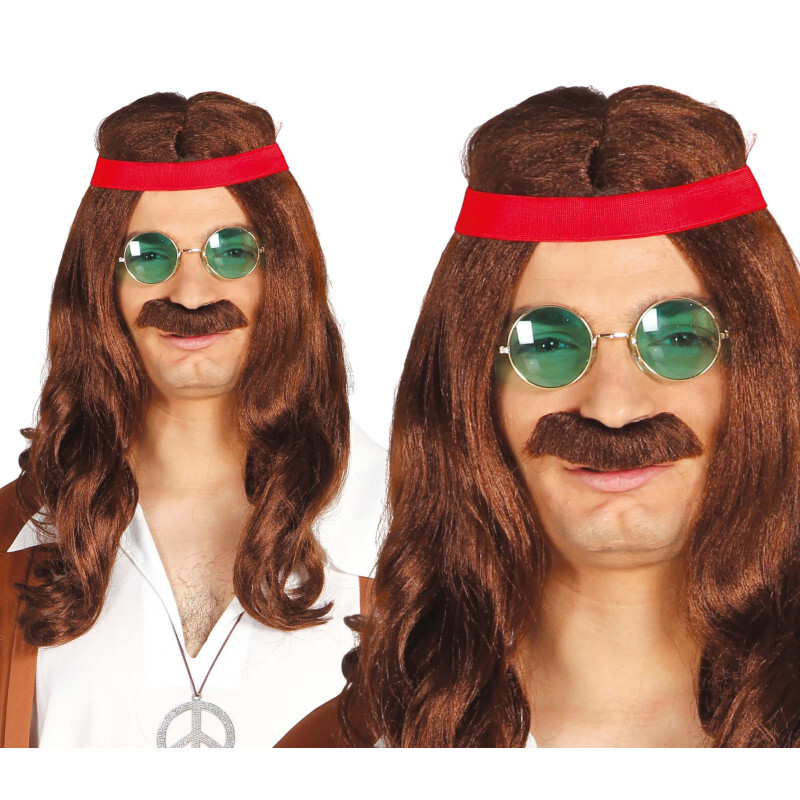 Pánská hnědá hippie paruka s čelenkou a knírem