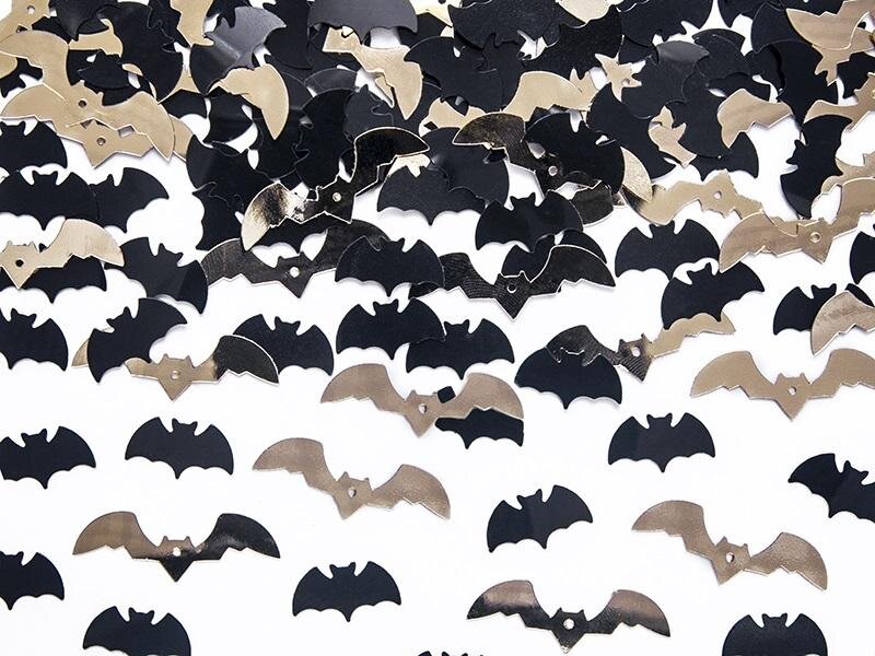 Konfetti Nietoperze w kolorze czarnym i złotym, wymiary 1,7x0,7 centymetra, 2,5x0,7 centymetra. prečítať celé