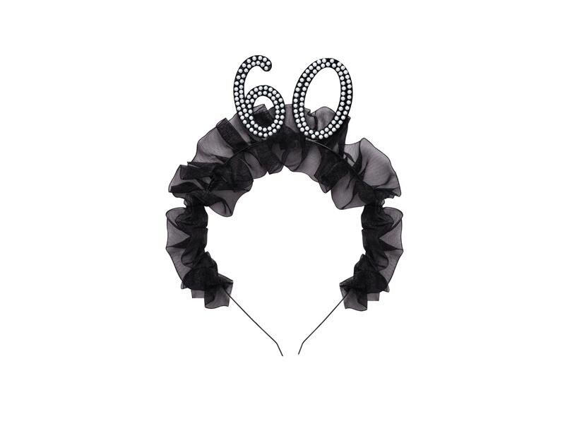 Opaska z czarną, materiałową falbanką oraz liczbą 60 udekorowaną perełkami. Rozmiar całościowy ok 12 x 19,5 cm. Wysokość samej liczby ok. 5,3 cm prečítať celé