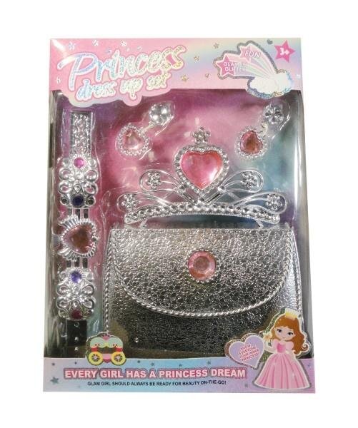 Zestaw biżuterii dla małej damy wraz z torebką. W zestawie tiara, kolczyki i bransoletka. W torebce dziewczynki będą mogły umieścić wszystkie najpotrzebniejsze rzeczy. Zestaw stanowi uzupełnienie kostiumu księżniczki na balik. Produkt zapakowany w kartonowe opakowanie z przezroczystym okienkiem. Zabawka dla dzieci od 3 lat. Podane wymiary są wymiarami opakowania.