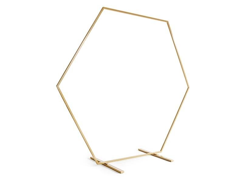 "Stojak na tło w kształcie heksagonu, wykonany z metalu w kolorze złotym, średnica po złożeniu ok. 2 m. Produkt łatwy w montażu, po złożeniu stanowi stabilną konstrukcję. Nadaje się do wielokrotnego użycia, idealny do profesjonalnego zastosowania. Stojak składa się z 8 elementów. Liczba elementów...