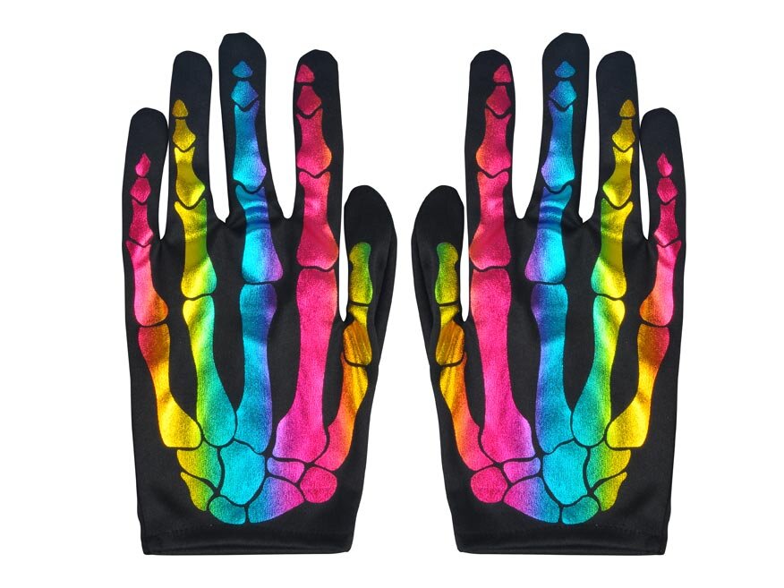 Oživte svůj kostým!Zářivé rukavice s potiskem kostí v duhových barvách dodají vašemu převleku originální šmrnc. Jsou ideální na Halloween, karneval, maškarní večírky nebo tematické párty. Díky elastickému materiálu skvěle padnou a jsou pohodlné i při delším nošení.Zaujměte svým vzhledem – ať už...
