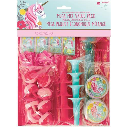 Jednorožec party set pro děti 48 ks Balení obsahuje: - 8 ks malé bločky na psaní 3,8 cm x 3 cm - 8 ks bludiště s kuličkou s motivem jednorožce, průměr 5 cm - 8 ks kouzelná hůlka transparentní s třpitkami v růžové a zelené barvě, výška 17 cm - 8 ks růžových prostýnků s kytičkou - velikost je...