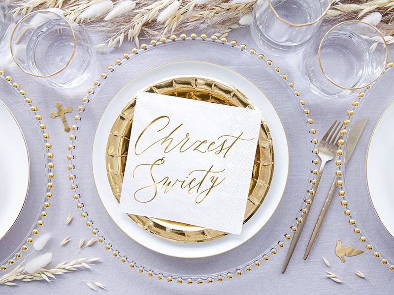 Serwetki papierowe w kolorze białym ze złotym metalizowanym napisem Chrzest Święty, wymiary po rozłożeniu ok. 33 x 33 cm, wymiary po złożeniu ok. 16.5 x 16.5 cm.(1 op. / 20 szt.) prečítať celé
