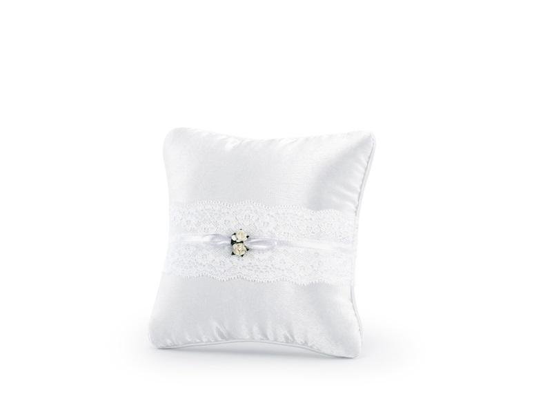 Poduszka pod obrączki z matowej tkaniny w kolorze białym, z koronką i białymi różyczkami, Kolekcja Vintage, wymiary 16x16 centymetrów. prečítať celé