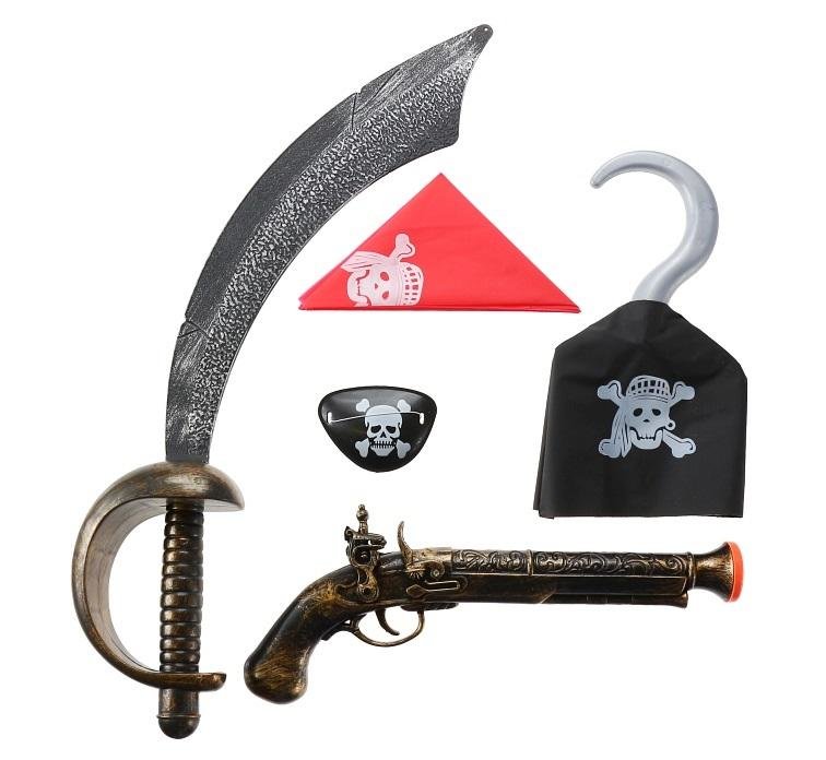ZESTAW DZIELNY PIRAT (Z HAKIEM) W skład zestawu wchodzą: szabla, pistolet, hak, opaska na oko, bandana Długość szabli: 48 cm Długość pistoletu: 28 cm Długość haka (z materiałem): 23 cm Materiał: plastik prečítať celé